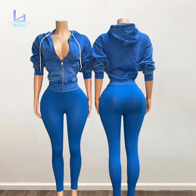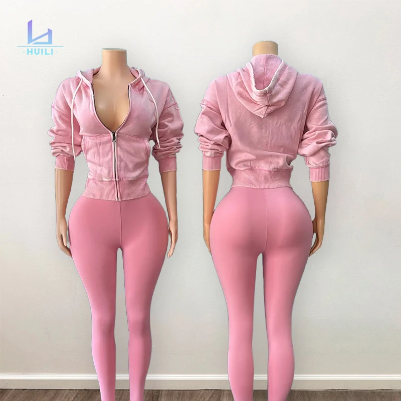 Huili Solid Color Blank Outfits Custom logo Vintage Activewear Y2k Acid Wash Zip up Hooded & Leggings Two Piece Women Hoodie Set